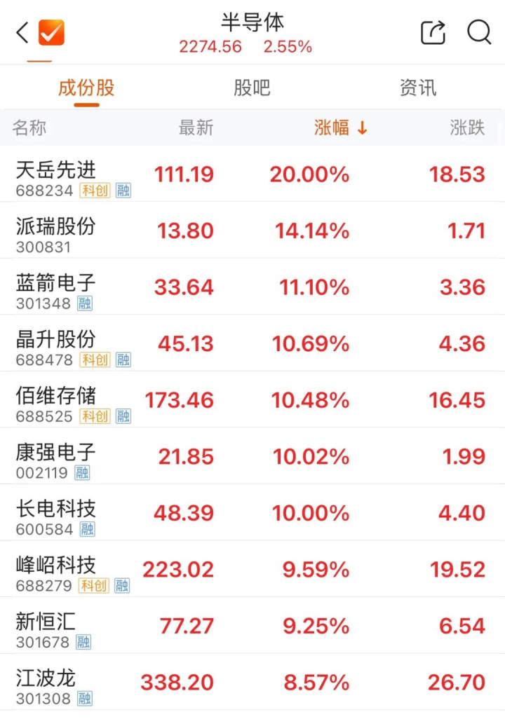 早盘,半导体产业链持续活跃,先进封装、存储芯片等多个方向走强。截至午间收盘,天岳先进以20%幅度涨停,蓝箭电子、佰维存储涨超10%,康强电子2连板。
